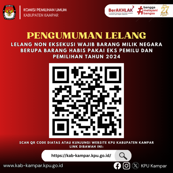 Berikut disampaikan PENGUMUMAN LELANG BARANG MILIK NEGARA EKS PEMILU DAN PEMILIHAN TAHUN 2024. Pengumuman dapat diakses melalui link dibawah ini: