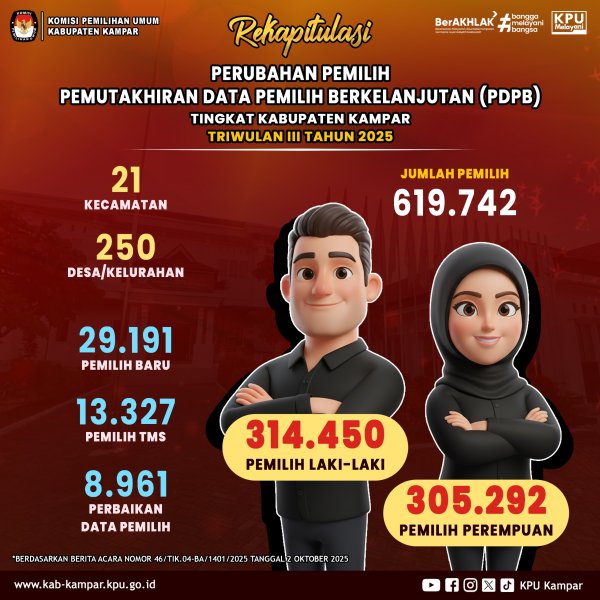 Berikut disampaikan KEPUTUSAN KPU KABUPATEN KAMPAR NO. 19 TAHUN 2025 TENTANG PENETAPAN REKAPITULASI DATA PEMILIH BERKELANJUTAN KABUPATEN KAMPAR TWIRULAN III 2025.
