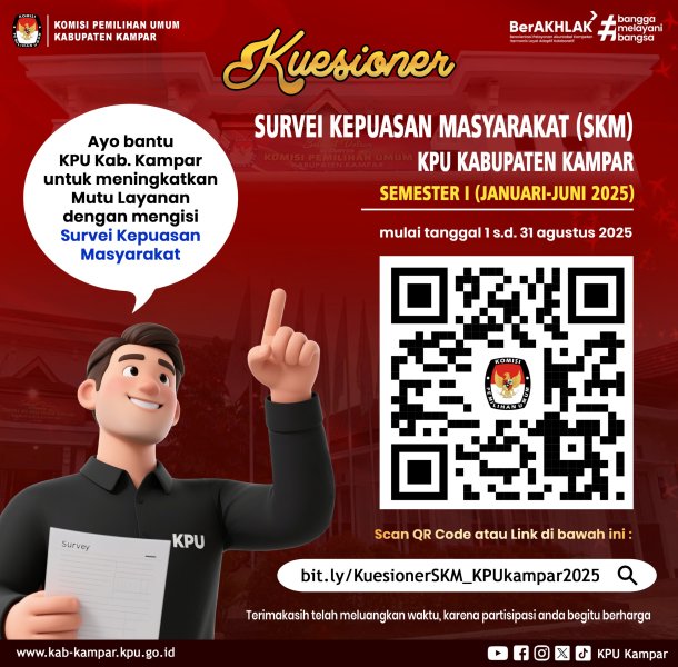 Teman pemilih, yuk isi Survey Kepuasan Masyarakat sebagai umpan balik dari pelayanan yang telah KPU Kampar berikan. link untuk mengisi survey dapat diklik melalui tautan dibawah ini ya.