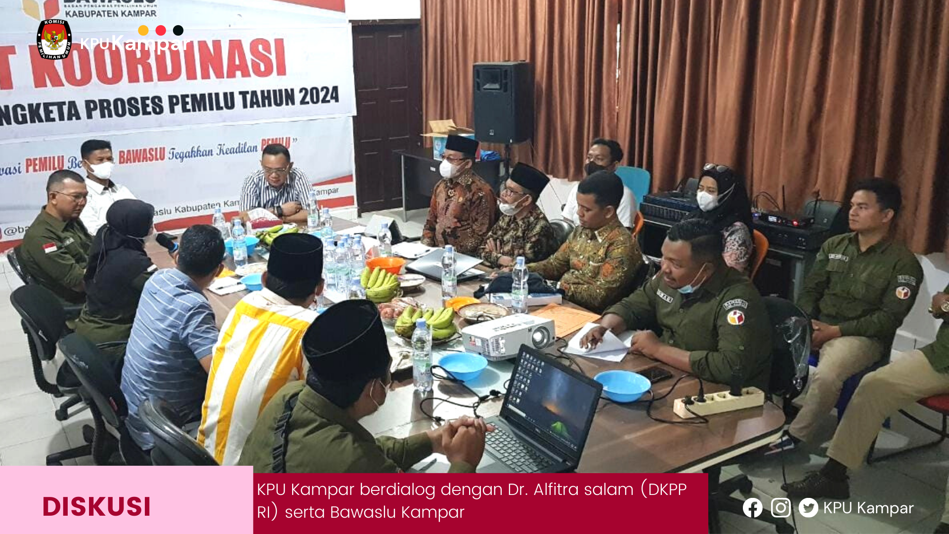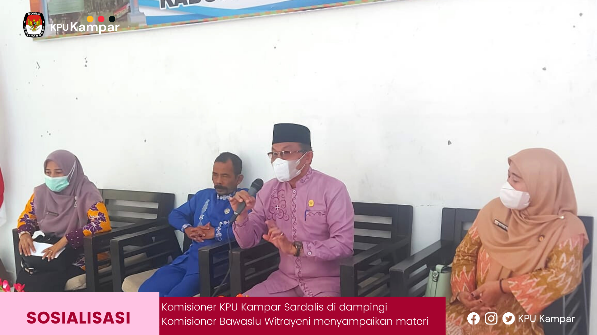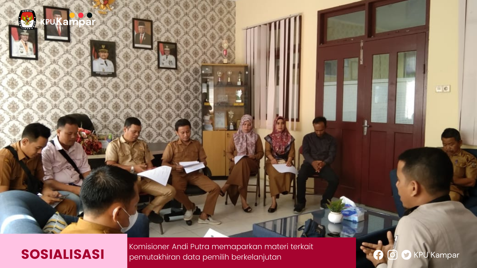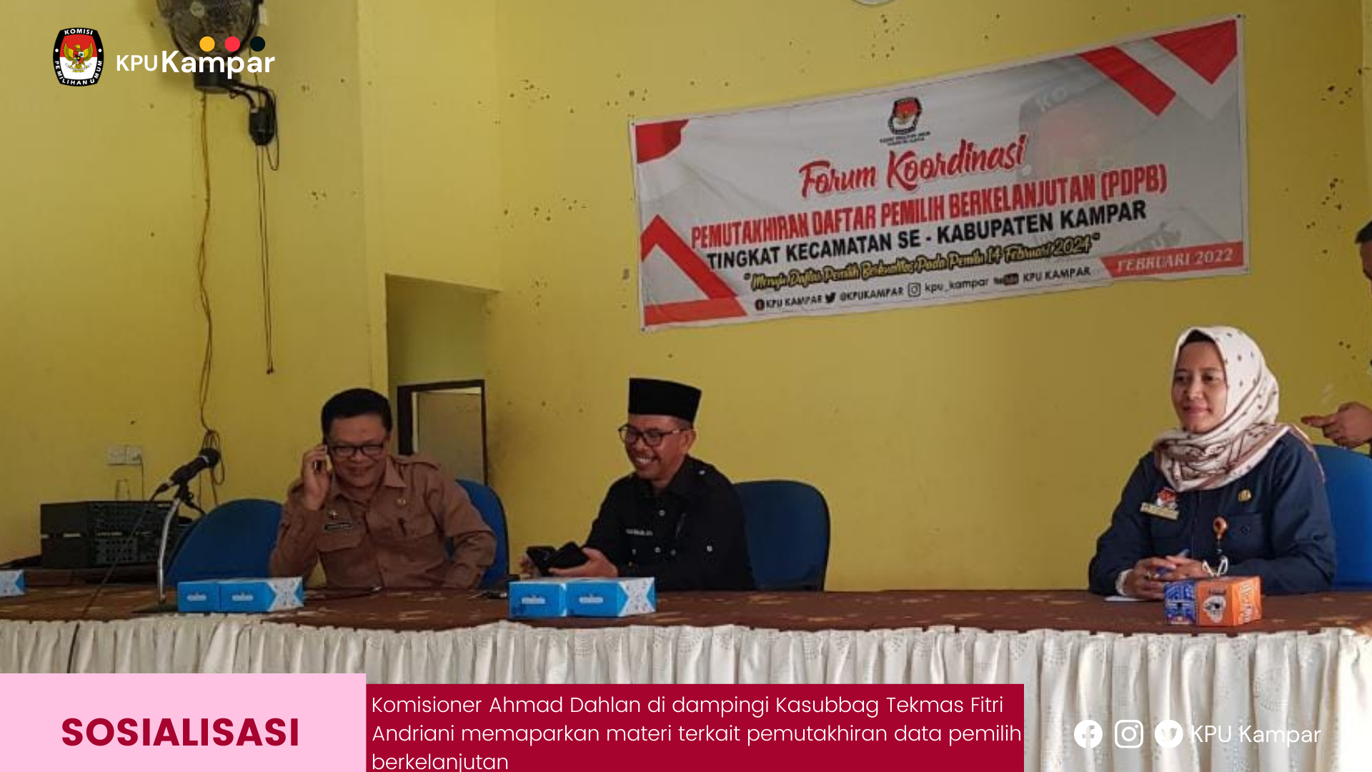 KPU Kabupaten Kampar bersama-sama Bawaslu Kabupaten Kampar melakukan sosialisasi Pemutakhiran Data Pemilih Berkelanjutan ke Kecamatan SIak Hulu, Kabupaten Kampar, Jumat (25/03/2022). Sinerji dua lembaga ini untuk memberikan informasi terkait kegiatan pemutakhiran daftar pemilih yang telah dilaksanakan KPU Kabupaten Kampar sejak beberapa bulan. Sosialisasi dengan cara membuka forum-forum koordinasi dengan perangkat desa difasilitasi oleh pihak kecamatan. “jadi melalui forum ini kita informasikan bahwa kegiatan pemutakhiran ini penting untuk diinformasikan kepada seluruh warga terutama pemilih yang ada di Kecamatan Siak Hulu. Apabila ada warganya yang tidak masuk dalam daftar Pemilu 2024 mendatang, segera sampaikan tanggapan atau masukan ke KPU Kampar,” jelas Anggota KPU Kabupaten Kampar, H Sardalis kepada perangkat desa dari 12 desa yang ada di Kecamatan Siak Hulu. Sardalis juga memberitahu bahwa KPU saat ini sudah menyediakan Aplikasi Lindungi Hakmu untuk mempermudah warga untuk mengecek data diri apabila tidak termasuk dalam daftar pemilih. “bahkan sekarang sudah jadi lebih mudah. Silakan unduh Aplikasi Lindungi Hakmu di Playstore untuk mengecek data diri apakah terdaftar atau tidak dalam daftar pemilih,” jelas Sardalis. Sementara Anggota Bawaslu Kabupaten Kampar, Witra Yeni yang turut hadir dalam sosialisasi tersebut juga menghimbau kepada seluruh perangkat desa yang ada agar memanfaatkan kesempatan ini untuk memperbaharui data warganya, agar pada Pemilu 2024 mendatang bisa menggunakan hak pilihnya. Bahan Witrayeni mengatakan bersedia membawa data warga untuk disampaikan langsung ke KPU. “saya bersedia memfasilitasi bagi bapak/ibu kades yang memiliki data warganya untuk disampaikan ke KPU. Jadi bapak/ibu kades cukup mengumpulkan saja data warganya, nanti saya sendiri yang akan menjemput dan menyerahkan ke KPU Kampar,” jelas Witrayeni.
