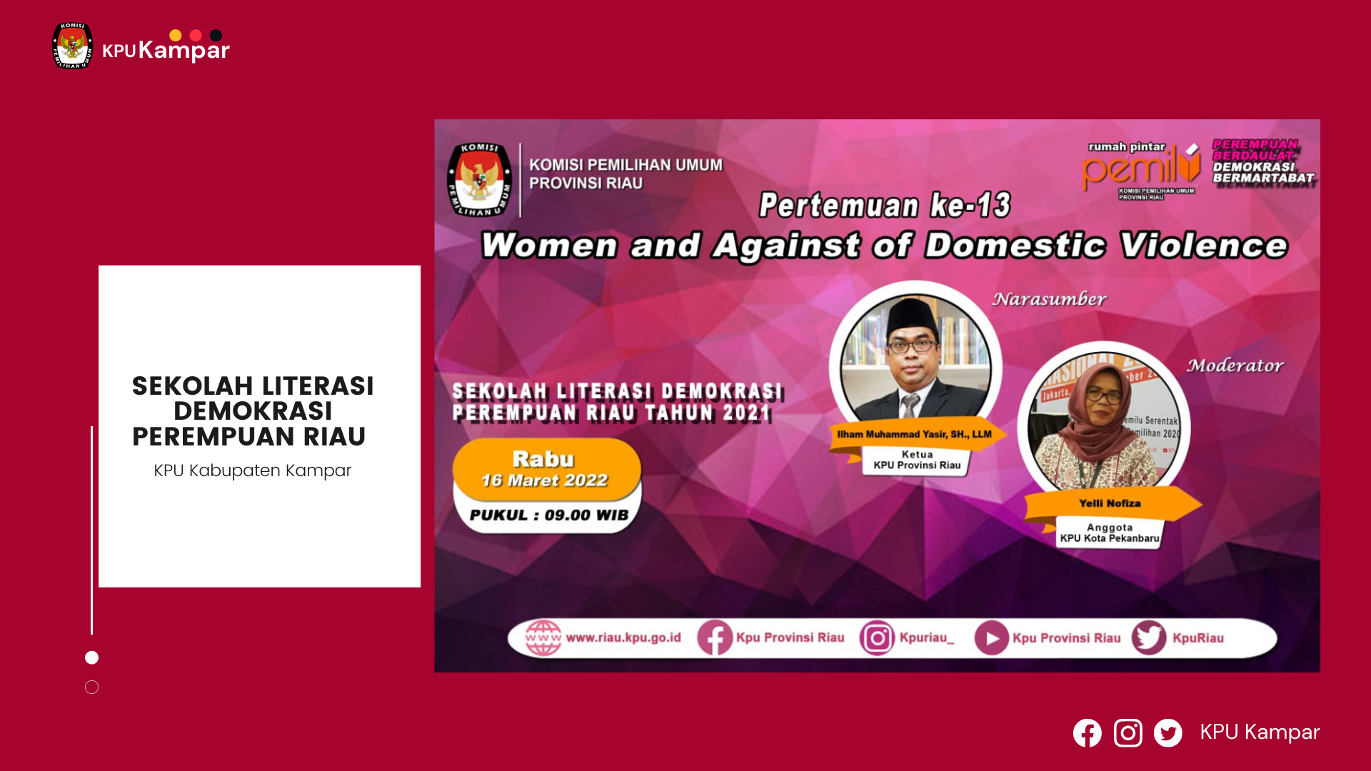Pertemuan ke-13 Sekolah Literasi Demokrasi Perempuan Riau (SLDPR) membedah materi tentang Perempuan dan Anti Kekerasan Dalam Rumah Tangga (Women and Againts of Domestic Violence), Rabu (16/03/2022). Berbeda dari kelas-kelas sebelumnya, materi yang dipaparkan kali ini banyak mengupas tentang bagaimana perjuangan para perempuan korban kekerasan ketika menjadi Tenaga Kerja Wanita (TKW) di luar negeri untuk mendapatkan keadilan. “saya ikut turun langsung menjadi aktivis pada saat itu untuk memberikan pendampingan kepada korban kekerasan di Malaysia. Mengikuti dan menyaksikan langsung proses korban-korban untuk mendapatkan advokasi dalam mencari keadilan,” ujar Ketua KPU Provinsi Riau, Ilham Muhammad Yasir selaku Narasumber memulai pemaparannya kepada peserta sekolah literasi. Seperti yang diketahui, selain sebagai komisioner, Ilham juga pernah berprofesi sebagai jurnalis dan pernah menjadi volunteer korban Human Traficking, Nirmala Bonat tahun 2004 silam. Dari pengalamannya mendampingi korban kekerasan, Ilham menyimpulkan ada beberapa aspek yang menjadi penyebab perempuan terutama TKW di luar negeri sehingga rentan menjadi objek kekerasan. Salah satunya faktor Pendidikan. “TKW kita yang bekerja di luar negeri rata-rata hanya tamat SD. Mereka kadang tidak selektif memilih agency yang akan memberangkatkan keluar negeri. Mereka dengan mudah tergiur iming-iming gaji besar dan fasilitas yang dijanjikan. Hingga akhirnya kadang menjadi korban ekploitasi,” jelas Ilham. Selain Pendidikan, factor komunikasi dan akses yang sangat terbatas juga menyebabkan para TKW berada pada posisi lemah. Para TKW yang bekerja di sektor domestik menjadi pembantu rumah tangga umumnya tinggal bersama majikan. “dengan kondisi paspor ditahan majikan, kontrak tidak kuat, dan akses untuk keluar atau komunikasi dengan pihak lain kadang tertutup, mereka rentan menjadi objek kejahatan majikan,” jelas Ilham. Ilham berharap, pengalaman yang disampaikan dalam kelas literasi mampu membuka mata dan wawasan peserta tentang bagaimana memunculkan perspektif gender. Yakni cara pandang bahwa ada hak-hak perempuan yang harus diperjuangkan. Dan perjuangan itu tidak hanya harus dilakukan oleh perempuan saja, tapi juga laki-laki secara bersama-sama. “itulah mengapa masalah-masalah yang dialami perempuan harus masuk dalam diskusi-diskusi public. Sehingga nanti akan muncul kelompok-kelompok yang memiliki perspektif gender atau kelompok-kelopok yang memahami perjuangan perempuan,” harapnya dihadapan 150 peserta dari 12 kabupaten/kota se- Provinsi Riau.